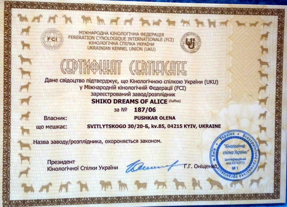 Питомник SHIKO DREAMS OF ALICE был зарегистрирован в 2003 году, и переименован в 2006 году.